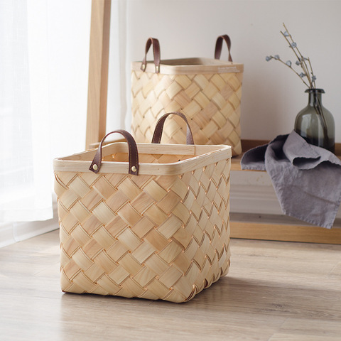 Handgeweven Houten Spanmand Met Lederen Handvat Rechthoekige Desktop Opbergmand Kwaliteit Opslagoplossing
